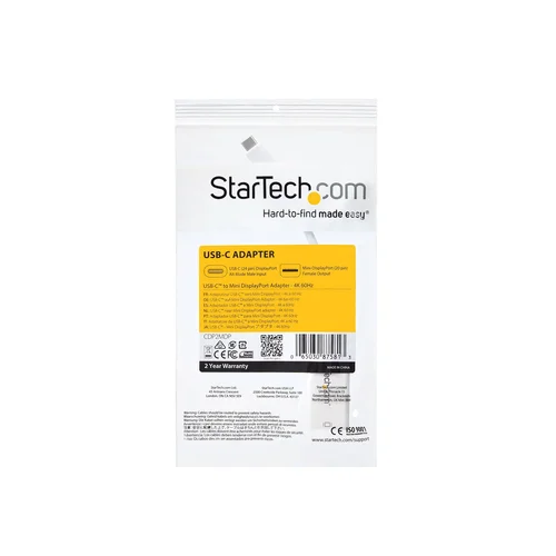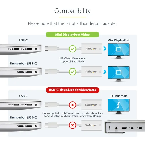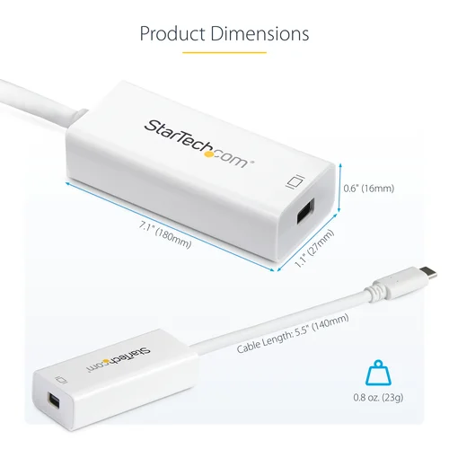 USB Type-C™ to Mini DP Adapter| Thunderbolt™ 3 Compatible | DP Alt ModeThis USB Type-C to Mini DisplayPort adapter lets you output mini DisplayPort (mDP) video and audio from the USB Type-C port on your laptop or other device. It works with USB 3.1 or Thunderbolt 3 Type-C devices that pass an mDP video signal, such as your MacBook Pro, Chromebook or 2018 iPad Pro.IT Pro PerformanceThis adapter features a unique video signal booster which amplifies the signal and ensures reliable performance, even with lower quality cables. The amplifier also increases the max. supported DP cable length compared to other brands.Enjoy High-Definition Resolution up to 4K at 60HzHarness the video capabilities that are built into your computer's USB-C connection, using the adapter to deliver the astonishing quality of UHD to your 4K 60Hz display.You can achieve an output resolution of up to 3840 x 2160p at 60Hz, perfect for high-resolution tasks such as viewing 4K video. The USB-C video adapter is backward compatible with 1080p monitors or displays, which makes it a great accessory for workspace applications.Hassle-Free Connection for Your USB Type-C LaptopThis adapter lets you use the versatile USB Type-C port on your portable device. USB-C is a reversible connector, enabling you to plug it into your device in any direction. The Thunderbolt 3 compatible adapter provides a hassle-free connection to your Windows or Mac based Thunderbolt 3 computer.Lightweight Design for Easy PortabilityThe compact USB-C to mDP adapter is lightweight and fits perfectly in your laptop bag. Its portable design is ideal for BYOD (Bring Your Own Device) applications at the office or on the road.The CDP2MDP is backed by a 3-year StarTech.com warranty and free lifetime technical support.Notes:•Your USB-C device must support DisplayPort over USB-C (DP Alt Mode) to work with this adapter•This adapter outputs a single-mode Mini DisplayPort signal and will not work with additional video adapters such as Mini DisplayPort to HDMI, Mini DisplayPort to VGA or Mini DisplayPort to DVI adaptersThe StarTech.com Advantage