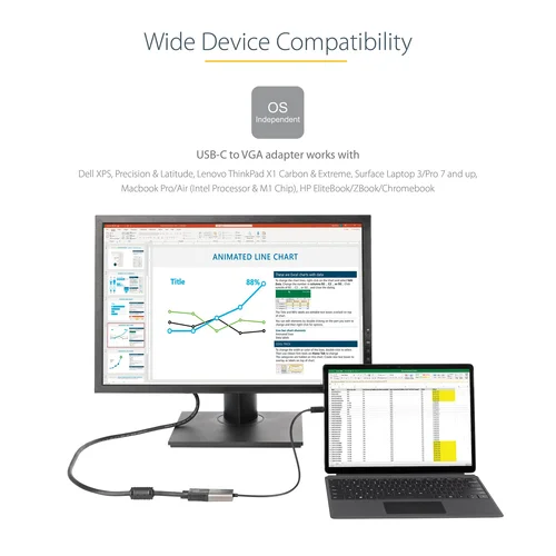 Extended Cable | 1920x1200p | Thunderbolt 3 CompatibleThis USB-Câ„¢ to VGA adapter enables you to output high-definition VGA video from the USB Type-Câ„¢ port on your laptop, tablet, smartphone or other USB C device.Extended Cable LengthThis USB C adapter is equipped with an extra-long 12" (30cm) attached cable, providing an extended reach to reduce port and connector strain on 2-in-1 devices or laptops on risers stands.HD Picture QualityThe adapter supports video resolutions up to 1920x1200 or 1080p. You'll be surprised at the picture quality the adapter provides, even when connected to a VGA monitor, projector or other display. The adapter harnesses the video capabilities that are built into your USB Type-C connection, to deliver every detail in stunning high-def resolution.Ultimate PortabilityThis USB Type-C video adapter is highly portable with a small footprint and lightweight design that's easy to tuck into your laptop bag while commuting between your home, office or traveling for business.The CDP2DVGAEC is backed by a 3-year StarTech.com warranty and free lifetime technical support.Notes:Your USB-C device must support DisplayPort over USB-C (DP alt mode) to work with this adapterThe StarTech.com Advantage