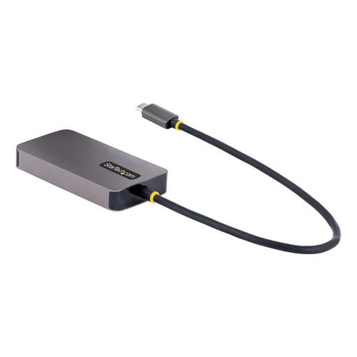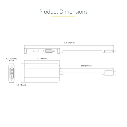 USB Type-C™ to VGA DVI or HDMI® Travel Adapter | 4K 60Hz | AluminumThis USB-C™ multiport video adapter offers a durable and portable solution for connecting your USB Type-C device to a n HDMI, DVI, or VGA display.Ultra HD 4K 60Hz ResolutionThe HDMI 2.0b output supports up to 4K 60 Hz resolutions and HDR whereas VGA output supports up to 1920x1200 at 60 Hz, and the DVI-I output supports up to 1080p at 60 Hz. All the outputs offer compatibility with older displays supporting lower resolution. The adapter supports dual mirrored 1080p displays when using either VGA and HDMI or VGA and DVI-I monitor configurations.Video Connectivity On The GoAvoid the hassle of carrying different adapters with a USB Type-C Multiport Video Adapter. Connect a USB-C DisplayPort Alt-mode device to virtually any display. A durable aluminum enclosure helps the adapter withstand being carried in a travel bag between office, home, shared spaces, and during business travel.Ease of UseThe USB Type-C Display Adapter is compatible with USB-C DisplayPort Alt-mode, Thunderbolt 3, Thunderbolt 4 Laptops, Ultrabooks, Chromebooks, and MacBooks. Plug and Play (PnP) capability allows you to quickly connect to devices running Windows, macOS, iPadOS, chromeOS, or Linux. The VGA and DVI outputs are compatible with screw locking cables ensuring a secure connection with displays and projectors. The 12 inch (30 cm) attached cable allows for flexibility in your setup and less strain on ports and connectors.118-USBC-HDMI-VGADVI is backed for 3-years by StarTech.com, including free 24/5 multi-lingual technical assistance.Note:This adapter does not support MST or dual extended displaysThe StarTech.com Advantage