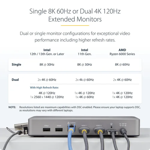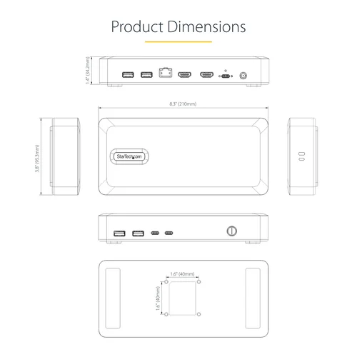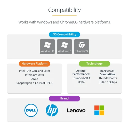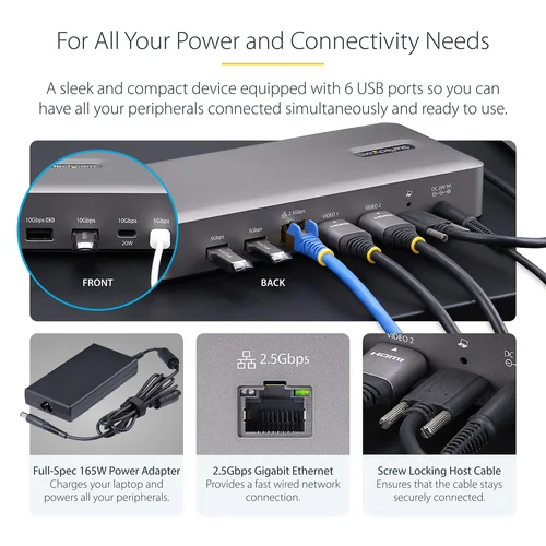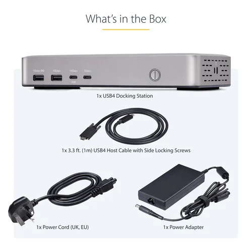 Turn a USB4 equipped laptop into a dual monitor workstationThis USB4 (USB-C 40Gbps) docking station uses a single USB4 or Thunderbolt port on a host computer to add high-performance connectivity while charging the laptop.Flexible High-Performance VideoThe dock is equipped with 2x HDMI 2.1 video outputs for connecting dual monitors to the host computer. The dock supports can support dual-monitors with support for resolutions up dual 4K 60Hz at 4:4:4 (RGB) or dual 4K 120Hz at 4:2:2. A single display workstation is also supported at resolutions up to 8K 30Hz 4:4:4 (RGB) or 8K 60Hz at 4:2:2.Port ConnectivityThe docking station utilizes the high 40Gbps throughput available from a Thunderbolt 4/3, or USB4 port to provide a wide range of port connectivity to suit a variety of applications.The dock features:• 2x HDMI ports to connect displays.• 6x USB Hub (2x 10Gbps USB Type-A, 2x USB Type-A 5Gbps, 1x USB Type-C 10Gbps, 1x USB-C 5Gbps) to connect USB peripheral devices.• 1x 2.5 Gigabit Ethernet port with PXE boot and WoL to connect to a wired Local Area Network (LAN)100W USB Power DeliveryIncludes a 180W power adapter and supports 100W USB power delivery. This enables the dock to charge the laptop, with enough additional power for all downstream ports. The 6-Port USB hub includes a 20W downstream USB-C Power Delivery port and a 7.5W BC 1.2 Downstream Charging Port (DCP) for charging tablets, smartphones or other battery-powered USB devices.Enhance Productivity and Device Management with the StarTech.com Connectivity Tools AppDeveloped to improve performance and security, Connectivity Tools is the only software suite on the market that works with a wide range of IT connectivity accessories. The software includes:•Advanced Windows Layout Utility : To setup and save custom windows layouts.•Mac Address Pass-Through Utility : To improve network security.•USB Event Monitoring Utility : To track and log connected USB devices•Wi-Fi Auto Switch Utility : Enabling users to quickly access faster network speeds via wired LAN.For more information and to download the StarTech.com Connectivity Tools application, please visit: www.StarTech.com/Connectivity-ToolsThe StarTech.com Advantage