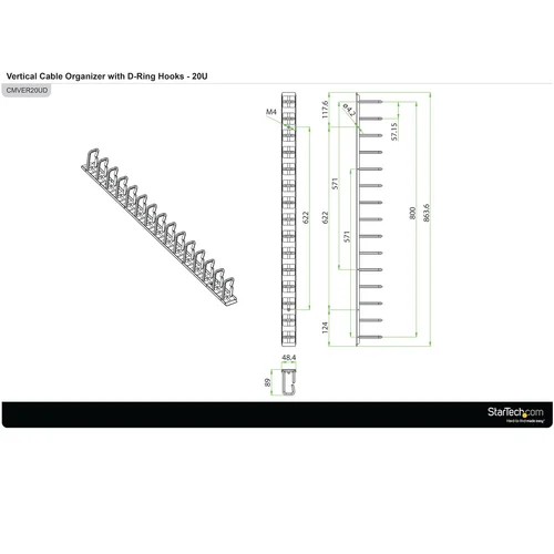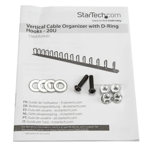 Organize your cables in any rack or cabinet that’s 20U or larger, using this vertical cable management panelThis 3-foot vertical cable manager gives you a simple and space-efficient way to organize the cables in your server rack. You can attach the cable manager vertically into your rack, to neatly guide cables between equipment that’s mounted at different heights.The 0U cable manager offers versatile installation options and is compatible with most racks that are 20U or larger. The panel features a 0U design that doesn’t take up any mounting space, and with simple tool-less installation it's easy to attach or reposition as necessary.Improve the appearance and accessibility of your rackThe cable manager uses a D-ring method of cable management to run cables vertically along the side of your rack, neatly guiding them between equipment that’s mounted at different heights. This provides a tidy and well-organized way to run cables from devices mounted toward the bottom of your rack to other devices mounted near the top, without leaving a mess of cables hanging in between.Having neatly organized and routed cables not only improves the appearance and accessibility of your rack, it also makes it easier for you to install, access and maintain rack components.Hassle-free compatibility with your rackFor maximum compatibility with virtually any server rack, you can install the cable-management panels using mounting holes that are commonly found on most rack equipment. The tool-less mounting method attaches the cable management panel to the keyhole-shaped mounting holes that are built into your rack.The horizontal mounting rail method attaches the cable management panel to the horizontal mounting rails that run along the side of your rack.For racks that don't support these installation methods, you can also mount the cable management panels through other means, such as using the non-standardized holes found on your rack walls and enclosures, or the rack units on equipment mounting rails.Protect your equipmentRouting your cables through a panel reduces the tension that's often put on cables. This prevents cable damage or connection loss, and reduces strain on equipment ports, preventing damage to your expensive rack-mount devices.Properly routing cables also improves airflow, which passively cools devices stored in your rack, helping to keep your equipment running at optimal temperatures to reduce the probability of damage caused by your rack overheating.The CMVER20UD is backed by a StarTech.com 2-year warranty and free lifetime technical support.The StarTech.com Advantage