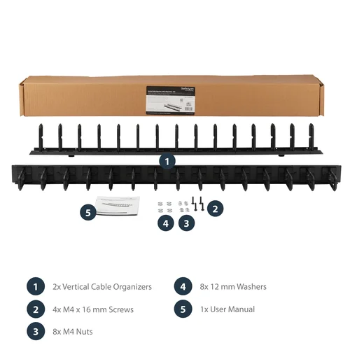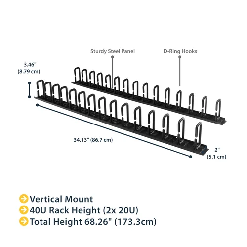 This 6-foot vertical cable manager (2 x 3-foot panels) gives you a simple and space-efficient way to organize the cables in your server rack. You can attach the two-panel cable manager vertically into your rack, to neatly guide cables between equipment that’s mounted at different heights.The 0U cable manager offers versatile installation options and is compatible with most racks that are 40U or larger. The panels feature a 0U design that doesn’t take up any mounting space, and with simple tool-less installation they’re easy to attach or reposition as necessary.Improve the appearance and accessibility of your rackThe cable manager uses a D-ring method of cable management that neatly guides cables running through it. Having well organized and routed cables not only improves the appearance and accessibility of your rack, it also makes it easier for you to install, access and maintain rack components.Configurable installation options with two 3 ft. panelsThis versatile cable management system consists of two 3-foot panels, so you can configure each panel as needed to accommodate all of your equipment. You can install the individual panels end to end (top to bottom), so that they span the height of your rack, or on either side or the front and back of your rack to manage cables in multiple locations. The two-piece cable manager runs vertically along the side of your rack, to neatly guide cables between equipment that’s mounted at different heights. This provides a tidy and well-organized way to run cables from devices mounted toward the bottom of your rack to other devices mounted near the top, without leaving a mess of cables hanging in between.Hassle-free compatibility with your rackFor maximum compatibility with virtually any server rack, you can install the cable-management panels using mounting holes that are commonly found on most rack equipment. The tool-less mounting method attaches the cable management panel to the keyhole-shaped mounting holes that are built into your rack.The horizontal mounting rail method attaches the cable management panel to the horizontal mounting rails that run along the side of your rack.For racks that don't support these installation methods, you can also mount the cable management panels through other means, such as using the non-standardized holes found on your rack walls and enclosures, or the rack units on equipment mounting rails.Protect your equipmentRouting your cables through a panel reduces the tension that's often put on cables. This prevents cable damage or connection loss, and reduces strain on equipment ports, preventing damage to your expensive rack-mounted devices.Properly routing cables also improves airflow, which passively cools devices stored in your rack, helping to keep your equipment running at optimal temperatures to reduce the probability of damage caused by your rack overheating.The CMVER40UD is backed by a StarTech.com 2-year warranty and free lifetime technical support.