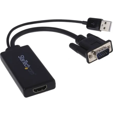 VGA2HDU VGA to HDMI Adapter With Audio And USB Power The VGA2HDU VGA to HDMI adapter lets you turn the VGA port on your Desktop or Laptop computer into an HDMI output port. With the VGA2HDU, you can expand your VGA video output to accommodate the increasing number of displays and projectors that only support HDMI. Not all VGA converters are created equal. This adapter ensures youre harnessing the highest video quality from your VGA output, with support for resolutions up to 1920x1080 (1080p). For hassle-free setup the VGA to HDMI adapter allows for plug-and-play installation. Plus, with a built-in USB power cable the device is powered using the USB port on your computer. The VGA to HDMI adapter will work with any computer operating system, but when working with a Windows® computer the adapter supports native USB audio, allowing you to add your computer audio to the HDMI signal. The VGA2HDU is backed by a StarTech.com 2-year warranty and free lifetime technical support. Features & Benefits • Supports video resolutions up to 1920x1080 • Plug-and-play installation • USB powered • USB audio • Compact, lightweight design • Hassle-free setup with plug-and-play installation • Maximum portability with USB power/audio, and compact, lightweight design Applications • Connect your VGA-equipped computer to an HDMI home theatre system • Share video content from your VGA-equipped computer on an HDMI television or projector • Connect a legacy VGA-equipped device to a newer HDMI display • Share audio from your Windows based PC What’s in the package? • VGA to HDMI adapter w/ USB power & audio • 2ft USB Extension Cable
