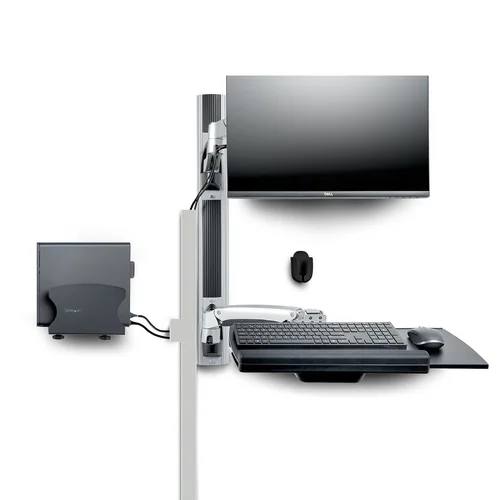 Mount workstation components to a wall, using this fully adjustable mounting systemMount this Wall Mount Workstation to create an ergonomic sit-stand desk setup for areas with limited space for a traditional desk. Use in offices, warehouses, (animal) clinics, or other limited space locations. The spring-assisted arms allow height adjustment to suit different users and maximize ergonomic positioning.Height Adjustment with One Smooth MotionThe mechanical springs in the monitor and keyboard arms enable independent toolless height adjustment of up to 12.4in (31.5cm) with effortless one-touch motion. For additional adjustments, reposition the arms along the wall track (2.8ft / 88cm) for a different height range.Optimal AdjustabilityThe VESA monitor mount supports a single standard 27" or 32" ultrawide monitor weighing up to 22lb (10kg) with 75x75 or 100x100 VESA mounting patterns. The monitor mount tilts +90°/ -20°; +/-90° swivels, and rotates up to 360° to accommodate vertical and horizontal monitor orientations.The monitor arm extends 24.1in (61.3cm) from the wall, while the keyboard tray extends 33.5in (85.3cm) away from the wall.Keyboard and Mouse TraysThe workstation features a large keyboard tray (17.6x8.1in / 44.9x20.7cm) and a retractable ambidextrous mouse tray (8.5x8.4in / 21.7x21.3cm) that slides in and out of the keyboard tray to suit right and left-handed users. The mouse tray and wrist rest are removable enabling for frequent cleaning of all high-touch surfaces making it ideal for a shared workstation.Free up additional floor space when the workstation is not in use by folding the workstation flush with the wall. Use the hook-and-loop strips to secure the keyboard to its tray and store the mouse in the dedicated holder.Desktop Computer Wall MountOptimize the workspace by mounting the desktop computer case to the wall under the keyboard tray with the included bracket (part 2NS-CPU-WALL-MOUNT). Enjoy unobstructed access to drive bays, peripheral ports, and wiring with the open design of the PC holder.Included spacers ensure a snug fit with different CPU tower sizes ranging from 1.9 to 7.8in (50 to 20cm) for most Small Form Factor (SFF) computers.For a neat and organized setup consider a wall cable management solution, part CBMWD3816 (sold separately).The StarTech.com Advantage