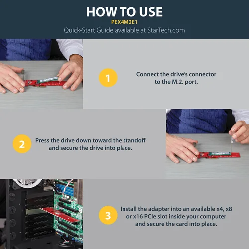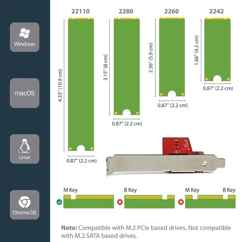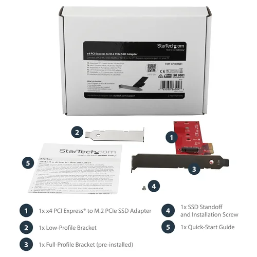 Connect a PCIe M.2 SSD (NVMe or AHCI) to your computer through PCI Express for ultra-fast data accessGet ultra-fast data access by adding a PCIe M.2 SSD to your existing computer. This adapter lets you add a high-speed, 4-lane M.2 SSD (PCIe-based), such as a Samsung 950 Pro or Samsung SM 951, to a PC with an available x4 PCI Express expansion slot. You can mount the PCIe M.2 drive directly onto the adapter, giving you an easy and convenient way to improve your system performance and expand overall internal storage.Boost your system speed and performanceThe expansion card lets you take full advantage of the fast performance and compact size of PCIe M.2 internal solid-state drives. The adapter connects directly to your computer motherboard to support an M.2 PCIe-based SSD (NVMe or AHCI) through ultra-fast x4 PCIe. The adapter is compatible with PCIe 3.0 motherboards and is also backward compatible with PCIe 2.0 and PCIe 1.0. With the M.2 PCIe based drive in place, the adapter gives your computer a significant speed boost.Supports PCIe M.2 SSDsThe adapter supports PCIe 3.0 x4 NVMe (M Key) and PCIe-AHCI M.2 SSDs including 2242, 2260, 2280, and 22110 drives. The expansion slot adapter supports the most common drive sizes including 110 mm, 80 mm, 60 mm and 42 mm.Easy to installThe expansion card is equipped with a full-profile bracket and includes a half-height/low-profile bracket, for installation in small form-factor computers.The PEX4M2E1 is backed by a StarTech.com 2-year warranty and free lifetime technical support.The StarTech.com Advantage