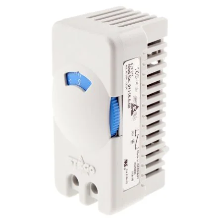 Stego Compact Click Dial Thermostats. Stego STO 011 / STS 011 series compact thermostats are two state regulators with small hysteresis and high switching capacity. The setting thumbwheel has an anti frost assurance whilst the housing ensures an optimized air circulation around the bimetal. The STO 011 (stock no. ; 743-1296 743-1296 ) thermostat (normally closed) is a contact breaker for regulating heaters. The STS 011 (stock no. ; 743-1290 743-1290 ) thermostat (normally open) is a contact maker for regulation of filter fans and heat exchangers or for switching signal devices when temperature limits have been exceeded. Switch temperature difference: 4K (±3K tolerance) Sensor element: thermostatic bimetal Contact type: snap-action contact Service life: ;100,000 cycles Max. switching capacity: 250 V ac, 10 (2) A; 120 V ac, 15 (2) A; 30 W dc at 24V dc to 72 V dc Max. inrush current: 16 A ac for 10 sec. Connection: 2-pole terminal for 2.5mm² (AWG 13), torque 1Nm max. Mounting: clip for 35mm DIN rail, EN 60715 Casing: plastic according to UL94 V-0, light grey Dimensions: 70 x 33 x 42mm Weight: approx. 50g Fitting position: variable Operating / Storage temperature: -45 °C to +80 °C (-49 to +176°F) Operating / Storage humidity: max. 90% RH (non-condensing) Protection type: IP20