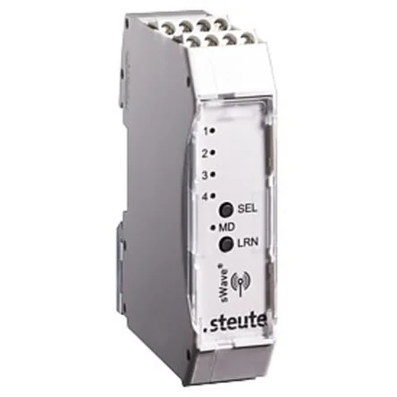 RF Rx SW868-4S Wireless Receivers With Relay Outputs. Steute RF Rx wireless receivers feature sWave 2.4 GHz wireless technology. The sWave wireless protocol offers a reliable, manageable and practicable wireless technology developed especially for safety-related industrial applications. The RF Rx receivers offer four relay outputs with LED indication of switching state. Features and Benefits. 4 NO relay outputs, max. 3 A. Low energy consumption. Fast link connection. sWave® wireless technology. Easy programming via teach buttons. SMA plug-in connector for external antenna. DIN Rail mounting