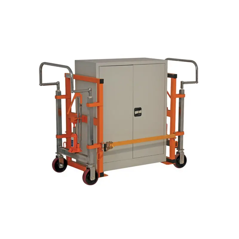 TheSTOCKMAN lift trolley - Polyurethane wheels - Load 1 8 tonnes - FM180B has a load capacity of 1 8 tonnes. This product consists of a pair of compatible trolleys. The flaps are made of non-slip rubber for good furniture support. The lifting is manual via a hydraulic pump. The lift trolley is made of very strong steel with swivel wheels fitted with polyurethane tyres. It is all equipped with a ratchet strap for added safety.