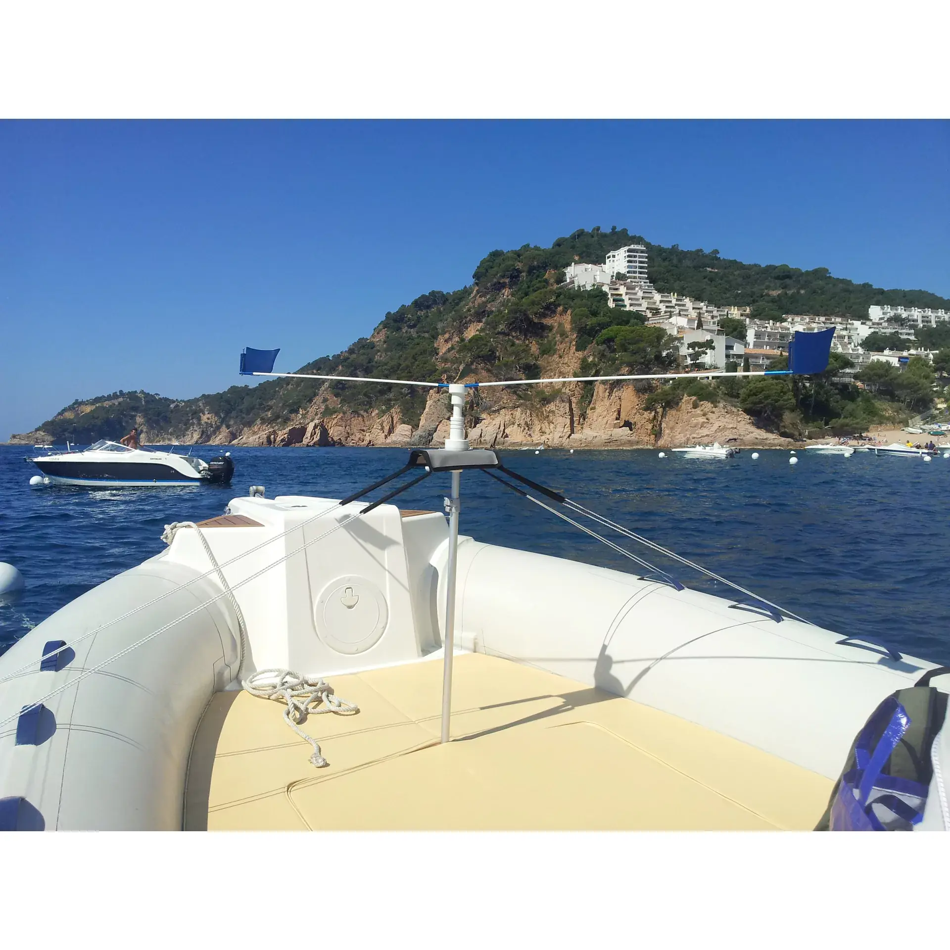 Kit support to fit the StopGull Air device to any kinds of inflatable boats. It's made of nautical acrylic fabric and flexible ropes with four hooks to fix at the external profile of the inflatable boat. It includes a telescopic mast for its final tightening.