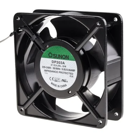 Sunon Axial FanThe Sunon sleeve bearing axial fan has 2300rpm motor speed. It has a supply voltage rating ranging from 220VAC to 240VAC and dimensions of 120mm x 120mm x 38mm. An extended ball bearing life ensures fault-free use for a significant period. This ensures ebm-papst AC fans provide a flexible and dependable cooling solution for applications that require an axial fan to be mounted in any axial position. This fan has a power consumption rating of 10W. These DP series AC Axial fans have a reliable shaded-pole motor construction and are specifically developed for higher operating voltages. Although it is suitable for industrial applications, it features eco-friendly technology that conserves energy due to its low power consumption. With a sturdy aluminium alloy frame and thermoplastic impellers, the DP series of AC axial fans are a reliable solution to thermal management applications. Frequently Asked Questions (FAQ) Q: What are the advantages of DP series fans? A: With low maintenance and power consumption, this range of fans are cost-effective and reliable. Q: What are the advantages of ball bearing fans over sleeve bearing fans? A: Ball bearing fans are typically less prone to wear and tear than sleeve bearing, which makes them ideal for longer service life. They are also able to operate in higher temperatures and any orientation. However, they are less rugged and can be more easily disrupted by impact, and tend to be noisier than their sleeve bearing counterparts. Q: Are compatible accessories available for these fans? A: Finger guards are (544-0548 and 111-8339) available for this fan.Features and BenefitsLow power consumption High-temperature resistance Impedance protected Service life of approximately 50000 hours Blow or extract mounting capability Counter-clockwise rotationApplicationsAir conditioners Heaters Medical equipment Automation control equipmentCertificationsUL approved TUV VDE