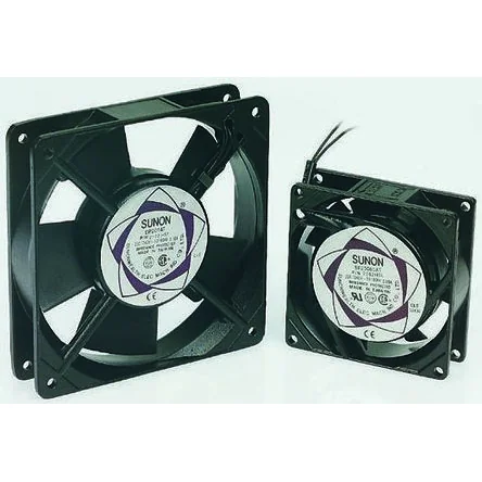 Sunon DP Series Sleeve Bearing AC Axial Fans. From Sunon, these DP series AC Axial fans have a reliable shaded-pole motor construction, and are specifically developed for higher operating voltages. Although they are suitable for industrial applications, they feature eco-friendly technology that conserves energy due to its low power consumption. With a sturdy aluminium alloy frame and thermoplastic impellers, the DP series of AC axial fans are a reliable solution to thermal management applications. Features and Benefits. • Low power consumption • High temperature resistance • Impedance protected • Service life of approximately 50000 hours • Blow or extract mounting capability • Counter-clockwise rotation • RoHS Compliant. Applications. This sturdy and low maintenance range of fans are suitable for a variety of applications. • Air conditioners • Heaters • Medical equipment • Automation control equipment. FAQ. Q: What are the advantages of DP Series fans? A: With low maintenance and power consumption, this range of fans are cost effective and reliable. Q: What are the advantages of Sleeve Bearings fans over Ball Bearing fans? A: While ball bearing fans can typically run for longer and in more harsh conditions than sleeve bearing, sleeve bearing have the advantage of having a simplified, often more cost effective design. Because of their simplified design, sleeve bearings are more impact resistance. Q: Are there compatible accessories available for these fans? A: There are finger guards ( ; 544-0548 544-0548 and ; 111-8339 111-8339 ) available for this fan.