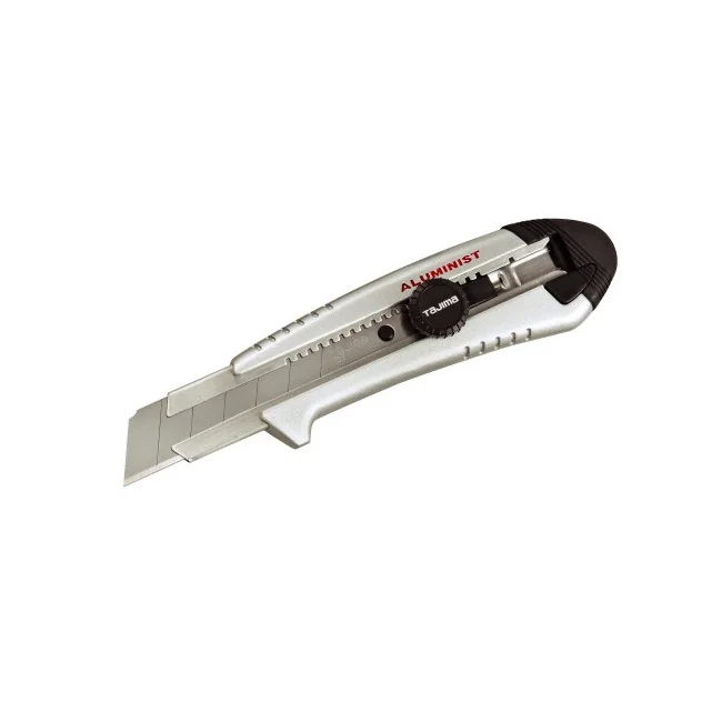 The Tajima Aluminist Cutter AC701 is a robust utility knife designed for precision and durability. Featuring a die-cast aluminum handle, it accommodates 25mm (1-inch) blades and includes in-handle blade storage for convenience. The cutter is equipped with a dial blade lock mechanism, ensuring secure blade extension and retraction. It comes preloaded with a Rock Hard blade, known for its sharpness and longevity.