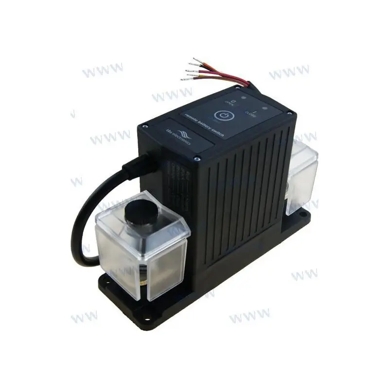 Smart magnetic contactor that can be controlled remotely via a switch or through a battery monitor. It is protected against high/low voltage and temperature. The buttons located on the top also provide a way to open or close the main contact locally. Status LED on the top clearly indicate whether the main contact is open or closed and alarm codes.