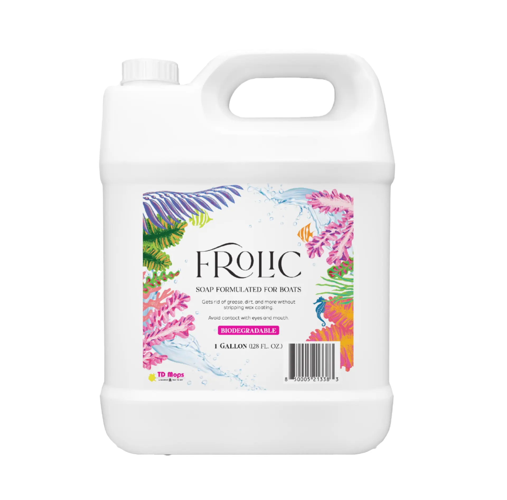 This one gallon boat soap by TD Mop is fully biodegradable and specially formulated for boats and yachts. Frolic removes dirt easily without stripping wax coating. It features an environmentally friendly formula and smells like a tropical paradise.