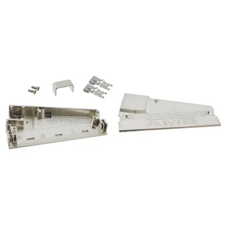 AMPLIMITE .050 Series III Shielded Backshell Kits with Spring Latches for SCSI D-sub Connectors. AMPLIMITE .050 series III shielded SCSI (50 and 68 way) d-sub backshell kits consisting of and upper and lower backshell made from from zinc with nickel over copper plating, 2 x stainless steel spring latches, stainless steel 2-56 screws and 1 x tin over nickel plated strain relief staple. These AMPLIMITE .050 series III d-sub backshell kits are available in 2 straight exit styles and one angled exit style and accept a variety of cable diameters. (Please refer to table and datasheet on our website for details).