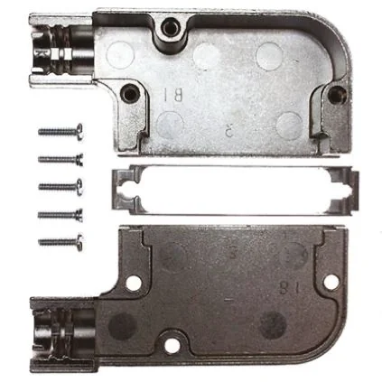 AMPLIMITE D-Sub Connector, HDE, HDP Series RFI/EMI 90 Degree Exit Die Cast Shielded Backshells. AMPLIMITE RFI/EMI shielded die cast 90° exit, two-piece backshell or cable clamp kits for use with HDE Metal-Shell and HDP Metal-Shell (tin plated only) d-sub cable connectors with a variety of cable diameter sizes (please see table for details). These AMPLIMITE RFI/EMI shielded two-piece backshells have nickel over copper plated zinc alloy shields and are supplied with 3 x zinc plated steel 4-40 pan head screws and 2 x latch head screws and a stainless steel one-piece slide-latch. For suitable ferrules see stock numbers ; 717-4653 717-4653 , ; 745-5791 745-5791 and ; 680-9383 680-9383 typically.
