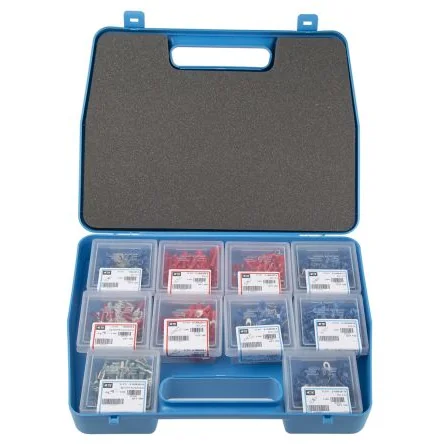 This crimp terminal ; splice case from TE Connectivity contains some of the most popular pieces from the Plasti-Grip series of terminals. It comes in a hard plastic case which is ideal for either storage or carrying about site. The selection of terminals and splices provided is suitable for a wide range of tasks. The blue plastic carry-case houses 10 smaller plastic boxes, each with different terminals and splices. There is 100 pieces within each smaller box. The best part is, if you run out of an item, this reusable case can be restocked with all your favourite pieces.. What is included?. The kit contains a range of butt splices, receptacles, ring terminals and spade terminals. Information on the pieces and their part numbers can be found in the table below.