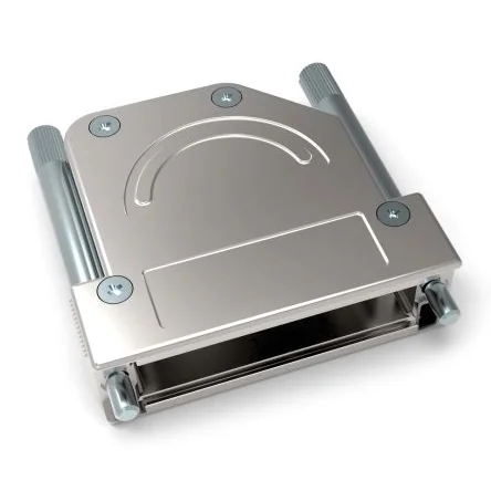 High-quality angled D Sub backshell with EMI shielding and versatile cable exit options.