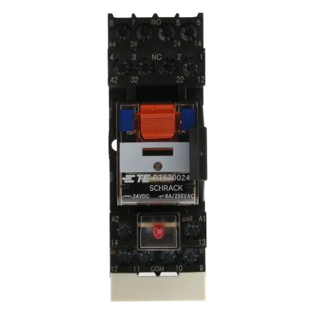 TE Connectivity Non-latching RelayThe TE Connectivity PT series DIN rail mount non-latching relay has contact configuration of 4PDT. It is actuated with 24VDC coil voltage and 6A switching current. This relay has a mechanical and electrical indicator and manual test tab. This package consists of the relay, DIN rail socket, module, retainer and marking tab.Features and BenefitsCoil resistance is 777ohm Coil power is 750mW Screw terminal type LED and protection diode module DIN socket has a logical arrangement of control/load terminals, with a second A2 terminal for easier loopingCertificationsANSI/ESD S20.20:2014 BS EN 61340-5-1:2007 IEC 61810-1 VDE approved
