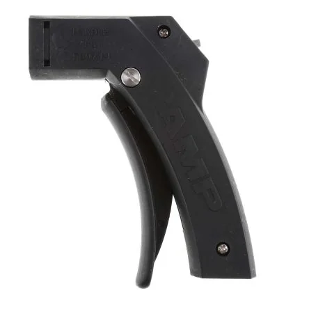 TE Connectivity Pistol Grip Manual Handle Assmembly. This manual pistol grip handle assembly (stock number ; 120-4477 120-4477 ) is for use with interchangeable terminating heads (please order separately) that terminate wires into a range of connectors using insulation displacement technique. This pistol handle assembly features a cam handle, a ratchet pawl, and a 'U' shaped key which secures the head in the handle assembly. Once the terminating head is installed in the handle the cam handle actuates the terminating mechanism inside the head. The ratchet control will not release until the cam trigger is fully closed ensuring a complete wire termination is achieved, the ratchet pawl can be used to release the handle before it is fully closed. The terminating heads are used to terminate the wires into connectors and guide the connector during termination. Termination is complete once the tool is actuated. For further details and user instructions please refer to the datasheet on our website
