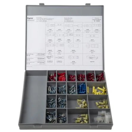 TE Connectivity PIDG Crimp Terminal and Splice Introduction Service Kit. The PIDG Crimp Terminal and Splice Introduction Service Kit from TE Connectivity contains 295 of the most popular terminals and splices from the PIDG and Plast-Grip ranges. The kit comes in a rugged plastic case which stores multiple different types of crimps and splices. The selection of terminals and splices provided is suitable for a wide range of applications and is a great introduction to this range. The kit is ideal for keeping in your workshop or transporting to jobs on-site. The case is divided into sections and each terminal type has its own compartment. There is even a spare compartment for a SUPER CHAMP II crimp tool (120-5313) - please note this is not included. The best part is, if you run out of an item, this reusable case can be restocked with all your favourite pieces.. What is included?. The kit contains a range of butt splices, receptacles, ring terminals and spade terminals. Information on the pieces and their part numbers can be found in the table below.