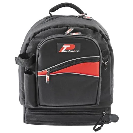 Technics Backpack. The best way of storing and transporting tools is using specially designed bags that feature easy-access compartments in a variety of sizes and are made from extra-durable materials. This professional, tool backpack from Technics is made from tough reinforced 600 denier fabric. It features a range of different sized pockets and pouches for storing safely an array of different hand tools while on the move. Adjustable and padded shoulder straps guarantee comfortable carrying of heavy loads. This stylish, functional and robust tool backpack from Technics have a professional design ideal for all-around professional and DIY applications. Features ; Benefits: • Made from reinforced material: 600 x 600 deniers to minimise wear and tear • For transporting tools securely and hands-free • Inner and outer pockets and compartments to secure tools, including a zipped base pocket • Adjustable shoulder straps • Reflective piping Typical Application: Tool Bags and Tool Backpacks are commonly used by professionals or DIY enthusiast for storing and transporting the required equipment. Specially designed compartments and durable materials guarantee a safe and comfortable operation for a long period of time. These type of bags are usually used by: • Plumbers • Electricians • Car mechanics • Carpenters • Builders • Gas Engineers FAQs: Is this backpack weather-proof? This backpack is made from a combination of 600 denier polyester fabric that guarantees a high level of water resistance. However, it doesn't mean the backpack is fully water protected and cannot be submerged. Is this backpack lockable? No, this backpack doesn't feature any locking mechanism Does this tool backpack come with a warranty? Yes, like all other Technics products this bag comes with a standard manufacturer's warranty. NOTE: No tools are supplied with this bag. Tools are shown for reference only.