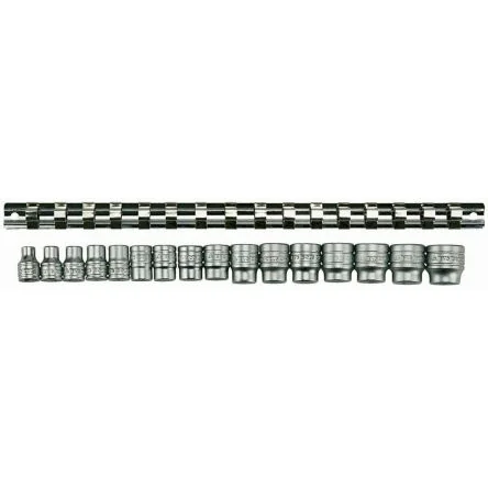 The Teng Tools 16 piece 3/8in drive regular metric 6 point socket clip rail set has the most commonly used sizes from 8 to 19mm. It is made up of chrome vanadium with satin finish and 6 point single hexagon socket for a better grip.Ball bearing recess on the female end to grip the ratchet or power bar Supplied with a clip rail with socket clips for easy storage as a set Designed and manufactured to DIN3120/3124 and ISO2725