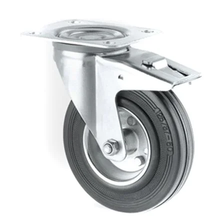 Swivel castor with total lock, tail end of castor, housing made of pressed steel, bright zinc plated, blue passivated, double ball bearing swivel head, wheel axle with nut, plate fitting. Wheel centre made of pressed steel, Tread: solid rubber, black, roller bearing