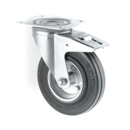 Swivel castor with total lock, tail end of castor, housing made of pressed steel, bright zinc plated, blue passivated, double ball bearing swivel head, wheel axle with nut, plate fitting. Wheel centre made of pressed steel, Tread: solid rubber, black, roller bearing
