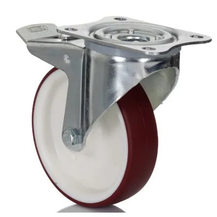 Red Polyurethane Tyre, Zinc Plated, Tente. Tente Zinc plated castor. These castors are available as locking or non-locking and feature universal fittings for easy alteration and maintenance. The body is manufactured from zinc plated steel that has been blue passivated for improved corrosion resistance. The wheels are manufactured from durable nylon polyamide with roller bearing and polyurethane tread. These castors are a good alternative for those wanting a quieter castor with softer contact. Swivel head versions have a double ball bearing head Polyamide wheel with roller bearing Red polyurethane tread Passivated Body for corrosion resistance