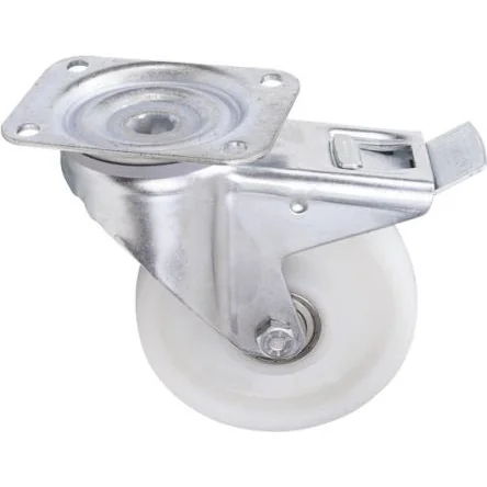 Industrial Medium Duty Castors, Series 3470 . Pressed steel zinc plated housing Protected double ball-bearing swivel top plate with dustguard, also braked version which locks body and wheel or fixed bracket Polyamide wheel, precision ball bearing hub Operating temperature: -40° to +80°C Applications include standard handling on hard floors Good resistance to abrasion