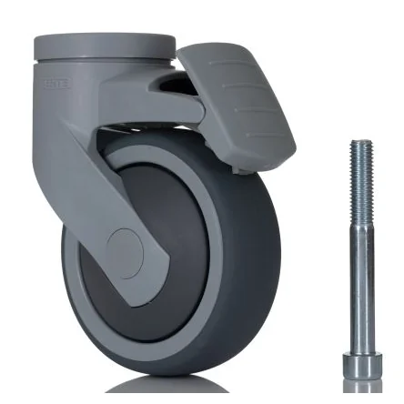 Institutional Castor - Synthetic, Series 5370. Tente Series 5370 LEVINA single wheel bolt-hole castors are manufactured from high grade synthetic materials that are generally resistant to all detergents and disinfectants currently available. The castors incorporate a double ball bearing precision swivel head, and grey TENTEprene (thermoplastic rubber) non-marking tyre. M10 bolts are included with the LEVINA castors which can be removed without removing the castor wheel. The polypropylene wheel castors can accept a static load of 200kg, and a dynamic load of 100kg. Features and Benefits. • Solid castor housing that guarantees long life • High quality tread materials ensure exceptional castor rolling properties • Short castor brake pedal offers easy operation and smaller swivel radius • Smooth surface making the castor design easy to clean • Modern castor design enhancing products that they are used with