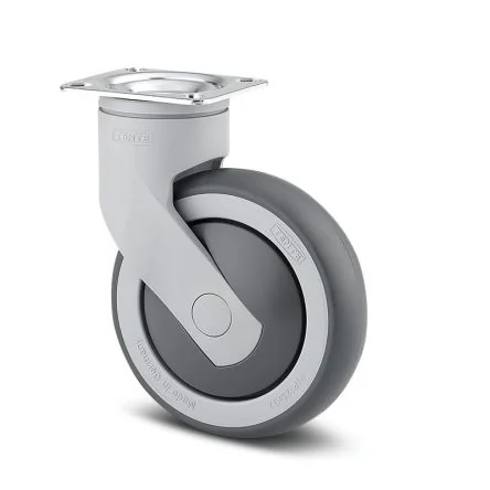 Swivel castor, housing and wheels made from high grade synthetic materials, double ball bearing swivel head, plate fitting. Wheel centremade of Polypropylene, Tread: TENTEprene (thermoplastic rubber), greynon-marking, precision ball bearing.