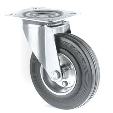Swivel castor, housing made of pressed steel, bright zinc plated, blue passivated, double ball bearing swivel head, wheel axle with nut, plate fitting. Wheel centre made of pressed steel, Tread: solid rubber, black, roller bearing