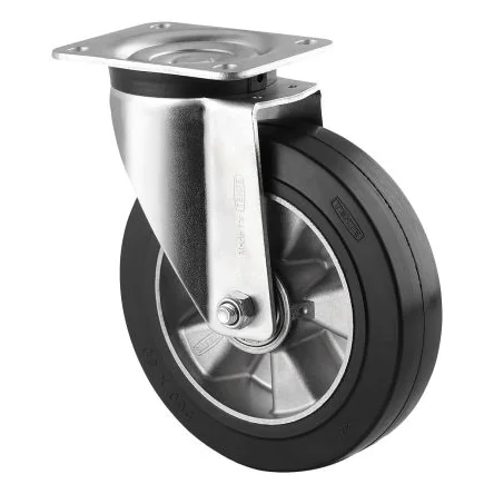 Tente Heavy Duty Plate Castor, Rubber Tyre. These heavy-duty castors from Tente are made from heavy sheet steel, with a broad reinforced fork and two ball races. The wheel has an aluminium body and precision ball bearing, and is made from black vulcanised rubber for durability. These castors are available as swivel, braked and fixed, in various wheel sizes. Features and Benefits. • Steel sheet • Broad reinforced fork • Two ball races • Swivel, braked and fixed castors • Aluminium wheel body • Elastic tyre, black vulcanised tread • Precision ball bearing • A range of wheel diameter sizes • Rectangular plate according to EN-R 42/43 • Shore A67