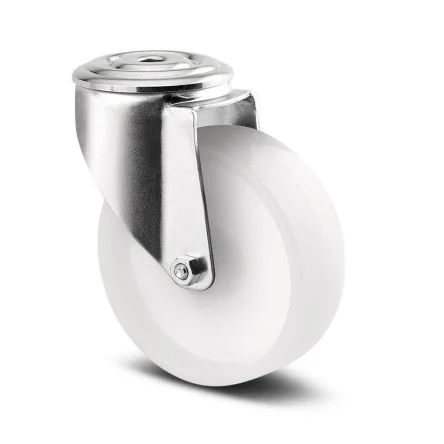 Swivel castor, housing made of pressed steel, bright zinc plated, blue passivated, double ball bearing swivel head, wheel axle with nut, bolthole. Wheel centre made of Polyamide, roller bearing