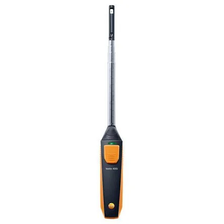 AAA batteries (x3), calibration protocol. Requires iOS 7.1 or newer, Android 4.3 or newer, mobile end device with Bluetooth 4.0. 2. testo 405i Thermal Anemometer, Bluetooth. The Testo 405i is a wireless hot-wire anemometer designed for measuring air flow, volume flow and temperature. The pocket-sized meter provides fast accurate readings at ventilation grilles, ducts and air outlets. Constructed from high-quality materials the tough mini anemometer is the ideal instrument for HVAC technicians and service engineers. Compact in design, the hand-held anemometer uses a combination of hot-wire and NTC thermistor sensor technology to deliver readings with extreme accuracy. Equipped with a telescopic shaft which can extend to 400mm the Testo 405i anemometer is ideal for applications where measuring space is hard to reach or limited. The 405i Bluetooth anemometer records wind speed from 0 to 20 m/s while the NTC sensor range goes from -20 to +60 °C. When used in combination with the Bluetooth Testo 605i thermal hygrometer ( ; 913-2585 913-2585 ), the Testo 405i is suitable for determining cooling or heating performance. The Testo 405i handheld anemometer connects via Bluetooth to Android, iOS smartphones and tablets. It can display real-time air temperature, airflow velocity and volume flow measurements on to the user's screen. The Testo Smart Probes App enables you to configure, view and calculate all from your mobile device. Additionally, all data and information can be saved into Excel and PDF formats for logging and sharing. Up to six separate devices can link to the App at any one time allowing remote system set up and monitoring. Testo Smart Probes App. The Testo Smart Probes App is available to download free from the App Store or Google Play and is compatible with all of the instruments from the Testo Smart Probes range. The app can display real-time measurements and results on the screen. Anything up to six Smart Probes can work in tandem and the information (including pictures) can be saved in Excel or as a pdf document. Features and Benefits. Slim, lightweight design Hot-wire and NTC sensors Fast, accurate, easy to read results Measures airflow speed, volume flow and temperature Measurement ranges 0 to 20m/s and -20 to +60°C Connects via Bluetooth to smartphone or tablet Up to 6 devices can connect at any one time Free Testo Smart Probes App for display and data analysis Save results in Excel or PDF Compatible with iOS 8.3 or newer, Android 4.3 or newer + Bluetooth 4.0 15-hour battery life / 3 x AAA batteries. Applications. Hot-wire anemometers are the ideal instrument for engineers and technicians looking to carry out tests and surveys on ventilation, air conditioning equipment. They are used to measure airflow and temperature quickly and accurately. The information and data they provide are vital in a wide range of applications and environments. They are essential for reporting, forecasting, planning and most importantly health and safety. Some of the more common applications are. HVAC system performance Environmental testing Clean rooms Air balancing Fans / motors / blowers Air conveyors Furnace velocity Wind Direction and gust