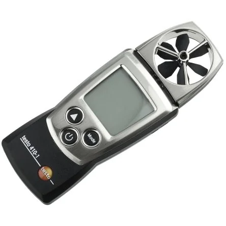Testo 410-1 Pocket Anemometer. From Testo, the 410-1 rotating vane anemometer designed for measuring air velocity and air temperature. The pocket-sized meter provides instant, accurate on the spot readings at ventilation grilles and air outlets. Constructed from high-quality impact resistant materials the robust meter is ideal for HVAC engineers and technicians. Compact in design, the handheld instrument features an in-built 40mm rotating vane which calculates the wind speed passing through the impeller. With a measuring range of 0.4 to 20 m/s, the 410-1 anemometer can even be used for low flow speeds. In addition, the 410-1 is able to simultaneously measure the air temperature thanks to the NTC sensor. Operation is simple, just 3 control keys enable the user to easily scroll through and select the desired function. The 410-1 displays the units for air velocity and temperature as m/s, km/h, fpm, mph, kts, Beaufort, ° C, °F and wind chill. With an illuminated display, all recordings are clearly shown on the front screen, even in low light and dark conditions. Suitable for both indoor and outdoor measurement applications the 410-1 includes a plug on protective cap for extra protection while not in use. An integrated wrist strap also provides extra security. Features and Benefits. Compact, hand-held design Ideal for indoor and outdoor applications Built-in 40mm rotating vane NTC Temperature sensor Simultaneous calculation of air flow velocity and air temperature Single-point averaging Hold function for recording current values Illuminated display Powered by 2 AAA batteries. Applications. Rotating vane anemometers are used to measure environmental conditions quickly and accurately. The information and data they provide are vital in a wide range of applications and environments. They are essential for reporting, forecasting and planning and more importantly health and safety. Some of the more common applications are. HVAC Construction Roofing Sailing, boating and windsurfing Climbing and hiking Aviation, wind direction, airflow and gust Weather stations and meteorological studies. FAQ. Q - Is there a recommended replacement battery? A - Yes, the Testo 410-1 anemometer uses Alkaline AAA batteries for its power supply. See RS part number ; 744-2209 744-2209