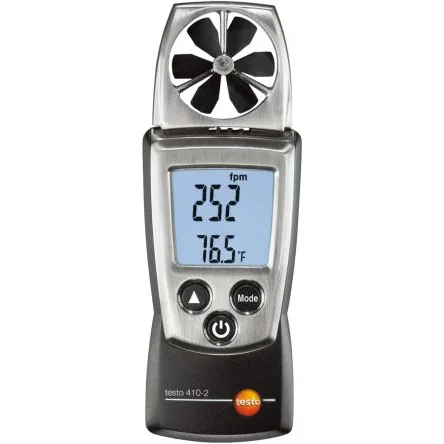 Testo 410-2 Pocket Anemometer. From Testo, the 410-2 rotating vane anemometer designed for measuring air velocity, air temperature and humidity. The pocket-sized meter provides instant, accurate on the spot readings at ventilation grilles and air outlets. Constructed from high-quality impact resistant materials the robust meter is ideal for HVAC engineers and technicians. Compact in design, the handheld instrument features an in-built 40mm rotating vane which calculates the wind speed passing through the impeller. With a measuring range of 0.4 to 20 m/s, the 410-2 anemometer can even be used for low flow speeds. In addition, the 410-2 is equipped with a humidity sensor and an NTC temperature sensor with a measurement range of -10 to + 50°C for air condition inspection. The user is, therefore, able to measure air temperature and humidity reliably. Operation is simple, just 3 control keys enable the user to easily scroll through and select the desired function. The 410-2 displays the units for air velocity and temperature as m/s, km/h, fpm, mph, kts, Beaufort, ° C, °F and wind chill. The Testo 410-2 also displays humidity, relative humidity, wet bulb and dew point temperature. With an illuminated display, all recordings are clearly shown on the front screen, even in low light and dark conditions. Suitable for both indoor and outdoor measurement applications the 410-2 includes a plug on protective cap for extra protection while not in use. An integrated wrist strap also provides extra security. Features and Benefits. Compact, hand-held design Ideal for indoor and outdoor applications Built-in 40mm rotating vane NTC Temperature sensor Simultaneous calculation of air flow velocity and air temperature Single-point averaging Hold function for recording current values Easy to read illuminated display Powered by 2 AAA batteries. Applications. Rotating vane anemometers are used to measure environmental conditions quickly and accurately. The information and data they provide are vital in a wide range of applications and environments. They are essential for reporting, forecasting and planning and more importantly health and safety. Some of the more common applications are. HVAC Construction Roofing Sailing, boating and windsurfing Climbing and hiking Aviation, wind direction, airflow and gust Weather stations and meteorological studies. FAQ. Q - Is there a recommended replacement battery? A - Yes, the Testo 410-2 anemometer uses Alkaline AAA batteries for its power supply. See RS part number ; 744-2209 744-2209