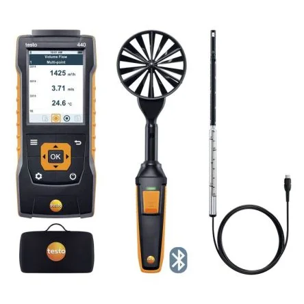 Testo 440 Air Flow ComboKit 1 with BluetoothKit for carrying out measurements in ventilation ducts and at air outlets: The testo 440 air velocity and IAQ measuring instrument, the vane probe (Ø 100 mm) with Bluetooth including temperature sensor and the hot wire probe including temperature sensor are all safely stowed away in the case. So you can get down to work straight away! Use this practical kit to handle all relevant measurements in ventilation ducts and at air outlets. The testo 440 multifunction measuring instrument, the vane probe and the hot wire probe including telescope all feature an intelligent calibration concept, ease of use and maximum convenience for the adjustment of air-conditioning and ventilation systems.Features and Benefits• Intuitive: clearly structured measurement menu for volume flow and parallel determination of air velocity, humidity and temperature in ventilation ducts or at ventilation outlets • Clever: hot wire probe with telescope (0.85 m) – combine the vane probe (Ø 100 mm) with Bluetooth with the telescope for ceiling outlets or the funnel set for plate outlets (please order separately) as required • Convenient: wireless probe, internal data storage and USB port for data export • As multifaceted as your challenges themselves: the air velocity and IAQ measuring instrument can be expanded with a large portfolio of digital probesTesto 440 air velocity and IAQ measuring instrument: • No task is too challenging, no application too specialized: the testo 440 combines a compact hand-held measuring instrument with intuitive measurement menus and a wide selection of air velocity and IAQ probes (please order separately) • Clearly structured measurement menus for carrying out measurements in ventilation ducts/at duct outlets: the volume flow is precisely calculated thanks to convenient input of the size and geometry of the duct cross-section. Timed and multi-point mean calculation, average volume flow, current reading and min./max. values are displayed • Other practical measurement menus, e.g. long-term measurement, volume flow measurement with a funnel, etc. • Easy storage and evaluation of measurement data. Measurement data memory for up to 7500 measurement protocols, which can be read via a USB port and further processed as a CSV file on the computer (e.g. with Excel) • Practical magnets for easy attachment of the measuring instrument to metal surfaces (e.g. ducts) • Automatic detection of probes, e.g. vane probe, hot wire probe Large, backlit colour display Vane probe (Ø 100 mm) with Bluetooth, including temperature sensor: • Use the vane probe (Ø 100 mm) to easily determine air velocity, volume flow and air temperature at air/ceiling outlets • Measuring range: +0.3 to +35 m/s, -20 to +70 °C • More applications – less equipment: the universal handle on your 100 mm vane probe is easy to attach to other probe heads or telescopes. This allows you to expand your portfolio of probes and save space in the measuring case • Carry out measurements at air/ceiling outlets effortlessly and without using a ladder: simply combine the vane probe with the optional, extendable telescope with 90° angle • Wireless: the Bluetooth handle makes it more convenient to carry out your measurements and guarantees less cable clutter in the case Practical button on the handle: to store individual readings for multi-point mean calculation or to start and stop measurement series for mean calculation over time • Our recommendation for carrying out accurate measurements at plate outlets/ventilation grilles: use the vane probe with the testovent 417 funnel set (available to order separately). If you add in the volume flow straightener (please order separately), you can achieve an impressively high level of precision when carrying out measurements at swirl outlets with turbulent air flow • Intelligent calibration concept: the testo 440 air velocity and IAQ measuring instrument remains in continuous use, since only the probe head with 100 mm vane is sent in for calibration Hot wire probe including temperature sensor: • Use the hot wire probe to measure air velocity, volume flow and air temperature in ventilation ducts • Accurate measurements from 0 to 30 m/s and -20 to +70 °C thanks to the robust sensor and automatic absolute pressure compensation • Telescope that can be extended to 0.85 m, with scaling, makes it easy to measure in ventilation ducts • Use the fixed cable to connect the hot wire probe to the measuring instrument • Intelligent calibration concept: you only need to send in the hot wire probe for calibration, so the instrument can remain in continuous use