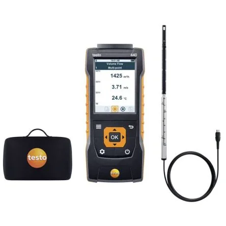 Testo 440 Hot Wire Kit in detailKit for carrying out measurements in ventilation ducts: the testo 440 air velocity and IAQ measuring instrument and the hot wire probe (Ø 9 mm) including temperature sensor are all safely stowed away in the case. So you can get down to work straight away! Use this practical kit to measure air velocity velocity, volume flow and air temperature in ventilation ducts. The testo 440 multifunction measuring instrument and the hot wire probe feature an intelligent calibration concept, ease of use and maximum convenience for the adjustment of air-conditioning and ventilation systems.Features and Benefits• Intuitive: clearly structured measurement menu for volume flow and parallel determination of air velocity, volume flow and air temperature in ventilation ducts • Convenient: integrated telescope that can be extended to 0.85 m, with scaling, makes it easy to carry out measurements • Reliable: absolute pressure compensation, internal data storage and USB port for data export • As multifaceted as your challenges themselves: the air velocity and IAQ measuring instrument can be expanded with a large portfolio of digital probesTesto 440 Hot Wire Kit in detailNo task is too challenging, no application too specialized: the testo 440 combines a compact hand-held measuring instrument with intuitive measurement menus and a wide selection of air velocity and IAQ probes (please order separately) • Clearly structured measurement menus: the volume flow is precisely calculated thanks to convenient input of the size and geometry of the duct cross-section. Timed and multi-point mean calculation, average volume flow, current reading and min./max. values are displayed • Other practical measurement menus, e.g. long-term measurement, volume flow measurement with a funnel, etc. • Easy storage and evaluation of measurement data. Measurement data memory for up to 7500 measurement protocols, which can be read via a USB port and further processed as a CSV file on the computer (e.g. with Excel) • Practical magnets for easy attachment of the measuring instrument to metal surfaces (e.g. ducts) • Automatic detection of probes, e.g. hot wire probe • Large, backlit colour display • Hot wire probe (Ø 9 mm) including temperature sensor: • Use the hot wire probe to measure air velocity, volume flow and air temperature in ventilation ducts • Accurate measurements from 0 to 30 m/s and -20 to +70 °C thanks to the robust sensor and automatic absolute pressure compensation • Telescope that can be extended to 0.85 m, with scaling, makes it easy to measure in ventilation ducts