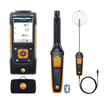 Testo 440 Indoor Comfort ComboKit with BluetoothFrom Testo, use this practical Indoor Comfort ComboKit to handle all relevant measurements in order to evaluate the indoor air quality in indoor areas and to determine the draught risk and degree of turbulence in workplaces. The testo 440 air velocity and IAQ measuring instrument, the CO2 probe with Bluetooth including temperature and humidity sensor and the turbulence probe are all safely stowed away in the case. So you can get down to work straight away! Use this practical Indoor Comfort ComboKit to handle all relevant measurements in order to evaluate the indoor air quality in indoor areas and to determine the draught risk and degree of turbulence in workplaces. The multifunction measuring instrument, the CO2 probe and the turbulence probe all feature an intelligent calibration concept, ease of use and maximum convenience for carrying out comfort level measurements.• Intuitive: clearly structured measurement menu for long-term measurement and parallel determination of CO2 concentration, humidity, air temperature and degree of turbulence in workplaces • Precise: calculation of wet bulb temperature, dew point and absolute humidity – determination of the degree of turbulence and draught risk according to EN ISO 7730 / ASHRAE 55 • Convenient: wireless probe, internal data storage and USB port for data export • As multifaceted as your challenges themselves: the air velocity and IAQ measuring instrument can be expanded with a large portfolio of digital probes Testo 440 Indoor Comfort ComboKit with Bluetooth in detailTesto 440 air velocity and IAQ measuring instrument: • No task is too challenging, no application too specialized: the testo 440 combines a compact hand-held measuring instrument with intuitive measurement menus and a wide selection of air velocity and IAQ probes (please order separately) • Clearly structured measurement menus: thanks to the menu guidance programmed into the instrument, you can determine the degree of turbulence and draught risk easily and reliably, in accordance with EN ISO 7730 and ASHRAE 55. Other practical measurement menus, e.g. long-term measurement: for long-term monitoring, enter the measurement time and measuring cycle in the measuring instrument and record measurement data trends • Easy storage and evaluation of measurement data. Measurement data memory for up to 7500 measurement protocols, which can be read via a USB port and further processed as a CSV file on the computer (e.g. with Excel) • Practical magnets for easy attachment of the measuring instrument to metal surfaces • Automatic detection of probes, e.g. CO2 probe, turbulence probe Large, backlit colour display CO2 probe with Bluetooth, including temperature and humidity sensor: • Measure CO2 concentration, humidity and air temperature and calculate dew point, wet bulb temperature and absolute humidity • Accurate measurement results thanks to air density compensation via the integrated absolute pressure measurement • Measuring range: 0 to 10,000 ppm, -10 to +50 °C, 5 to 95% RH • The Bluetooth handle makes it more convenient to carry out your measurements and guarantees less cable clutter in the case Practical button on the handle: to store individual readings • Endlessly versatile: a universal handle can be connected to all probe heads – so you can take care of more applications using less equipment, and save space too • Intelligent calibration concept: the measuring instrument remains in continuous use, since only the probe head is sent in for calibration Turbulence probe including air velocity and temperature sensor: • Use the turbulence probe to measure air velocity and air temperature Determine the degree of turbulence and draught risk according to EN ISO 7730 / ASHRAE 55 • Accurate measurements from 0 to +5 m/s within the temperature range 0 to +50 °C thanks to air density compensation via the integrated absolute pressure measurement • Our recommendation for exceptionally easy positioning of the turbulence probe in compliance with the standards: order the measuring tripod for comfort level measurements • Use the fixed cable to connect the turbulence probe to the measuring instrument • Intelligent calibration concept: You only need to send in the turbulence probe for calibration