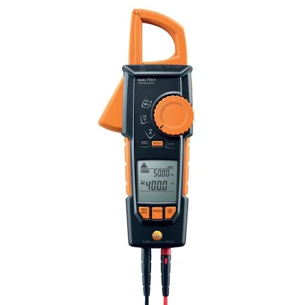 EN 61326-1, EN 61140. TÜV, CSA, CE. Testo 770-1 TRMS clamp meter, batteries and 1 set of measuring cables. 2. Testo 770-1 Clampmeter. Testo 770-1 is suited for current measurement in switching cabinets. One of the two pincer arms can be fully retracted into the instrument. This unique mechanism means that cables in tight switching cabinets can be easily grabbed. The automatic measurement parameter detection also enables reliable work. Testo 770-1 detect direct and alternating current and select other parameters such as resistance, continuity, diode and capacitance automatically. Innovative clamp mechanism for easy operation in narrow spaces Extra functions such as inrush, power and µA measurement Auto ac/dc True RMS Voltage measuring range: 1 mV to 600 V ac/dc Current measuring range: 0.1 A to 400 A ac/dc Display (counts): 4000. Benefits. No more problems grabbing cables in confined spaces Grab cables with the clamp instead of touching them Clear visible measurement results