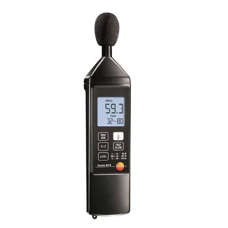 Testo Sound Level MeterThe Testo 815 is an 8KHz sound level meter. It is an ideal instrument for the evaluation of sound level measurements. The fast/slow button enables you to set the measurement time between 1s and 125ms. The frequency analysis can be obtained from characteristic curve A to C where curve A corresponds to the sound pressure perception of the human ear and curve C evaluates the low-frequency components of a sound. This meter can measure the sound levels between 30dB and 130dB. It has a wind protection cap that ensures correct measurement and protects the microphone from dirt and dust.Features and BenefitsBuilt in tripod screw Easy to calibrate and adjust High accuracy with ±1.0dB Maximum and minimum function Resolution is 0.1dB Selectable sampling rateApplicationsHeating technology Measurement of machinery noiseCertificationsIEC 60651 Class 2