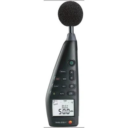 Microphone, wind protection, PC software, connection cable, manual on CD, batteries, system case. Testo Sound Level Meter 816-1. Testo Sound Level Meter 816-1 can, at the touch of a button, be switched from Slow (1 sec) to Fast (125 ms). It is also possible, again at the touch of a button, to switch between the frequency weighting characteristic curves A and C and vice versa. Characteristic curve A corresponds to the sound pressure sensitivity of the human ear, while characteristic curve C can evaluate low-frequency components of a noise. The 816-1 integrated data store allows storage of more than 30,000 measurement values that can be administered using the software included. Additionally, the supplied software allows online measurements over a longer period to be carried out. Applications of the 816-1 include sound level measurements at workplaces, in industrial and production halls, and in public places. The instrument is powered by AA (x4) batteries. Sound level measurement accuracy to IEC 61672-1 class 2 and ANSI S1.4 Type 2 Frequency weighting A and C Integrated data storage for up to 31,000 measurement values Software for data management and long-term measurement Switchable time weighting Fast/Slow Bar graph display Backlit display AC and DC output for the connection of other instruments