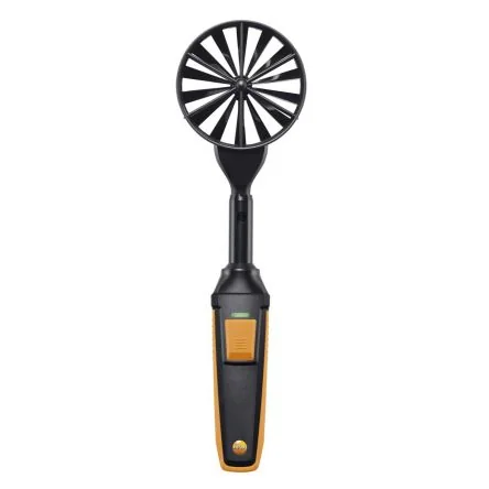 Vane Probe with Bluetooth including Temperature Sensor in DetailUse the vane probe to determine air velocity, volume flow and temperature at air outlets, as well as at plate outlets, ventilation grilles or swirl outlets. The readings are transmitted directly to your measuring instrument via Bluetooth, making your measurements particularly convenient. Use the vane probe with the compatible testo multifunction measuring instrument (please order separately) to measure air velocity, volume flow and temperatures up to +70 °C.Feautres and Benefits• Intuitive: clearly structured measurement menu for volume flow and parallel determination of air velocity, volume flow and air temperature • Precise: get the right results in next to no time, even in turbulent air flow – using the optionally available funnel set and volume flow straightener • Convenient: Bluetooth connection between measuring instrument and probe, with a practical button on the handle for storing individual readings, convenient measurement at ceiling outlets with optional telescope (up to 1 m) • Intelligent calibration concept • 0,3 to 35 m/s Velocity / Volume FlowVane Probe with Bluetooth including Temperature Sensor in Detail The readings of the vane probe are transmitted to your measuring instrument via Bluetooth, up to a distance of 20 m. The clearly structured measurement menu for volume flow enables the measuring instrument to be operated intuitively. The volume flow is precisely calculated thanks to convenient input of the size and geometry of the duct cross-section. Timed and multi-point mean calculation, average volume flow, current reading and min./max. values are displayed in the measuring instrument. Particularly useful: press the button on the vane probe to operate the measuring instrument. For example, to store individual readings for multi-point mean calculation or to start and stop measurement series for mean calculation over time. Wireless and space-saving: more applications, less equipment Endlessly versatile: a universal handle can be connected to all probe heads – so you can master more applications using less equipment and save space. The Bluetooth handle makes it more convenient to carry out your measurement and guarantees less cable clutter in the case. Or order the cable handle to connect testo probe heads. This is an advantage if Bluetooth signals are not permitted. If the vane needs to be replaced in the distant future, you can change the probe head. If required, you can also fit the vane probe with the extendable telescope with 90° angle and, if necessary, the telescope extension (both can be ordered separately; in combination 2 m long). This makes it easy to measure at ceiling outlets. Intelligent calibration concept You will get exceptionally accurate measurement results with the digital vane probe, because the measuring instrument makes measurement uncertainty a thing of the past. You only need to send the probe head in for calibration – so the measuring instrument remains in continuous use. Areas of application for the vane probe with Bluetooth Air/ceiling outlets: Use the vane probe to determine air velocity and volume flow at air outlets. During loop-pattern scanning of the grille’s cross section, the air velocity values are integrated and averaged across a large area of 100 mm. As a result, precise measurement results are achieved with the loop measurement. For measurements at ceiling outlets: the extendable telescope (1.0 m long) with easy-to-read scaling and 90° angle is easy to attach to the vane probe. The 90° angle ensures that the probe is positioned correctly under the ceiling. For high ceilings, you can also use the telescope extension, attaining a total length of 2 metres (please order the extendable telescope and telescope extension separately). Plate outlets, ventilation grilles and swirl outlets: For convenient, accurate measurements at plate outlets and ventilation grilles, we recommend using the vane probe with the testovent 417 funnel set (please order separately). This guarantees simple testing of incoming/outgoing air – such as in the controlled ventilation of living spaces. If you add in the volume flow straightener (please order separately), an impressively high level of precision can be achieved when carrying out measurements at swirl outlets.