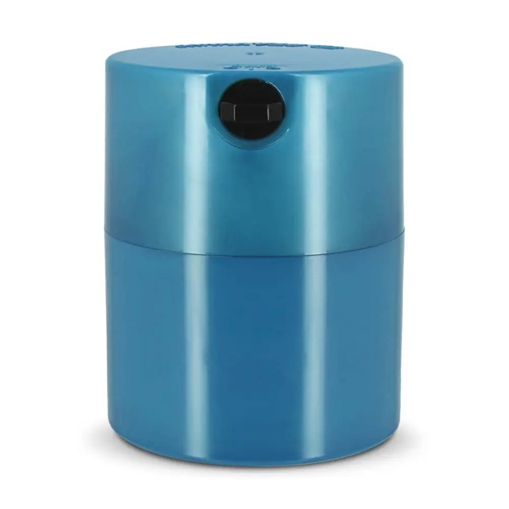 blue opaque box with grinder to store tobacco and herbs in a vacuum.