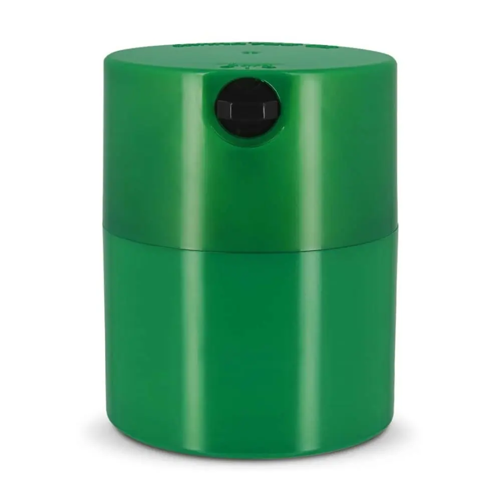 Opaque dark green box with grinder to store tobacco and herbs in a vacuum.