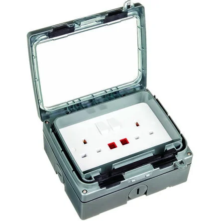 Weatherproof 2 gang plug socket for safe outdoor power access.