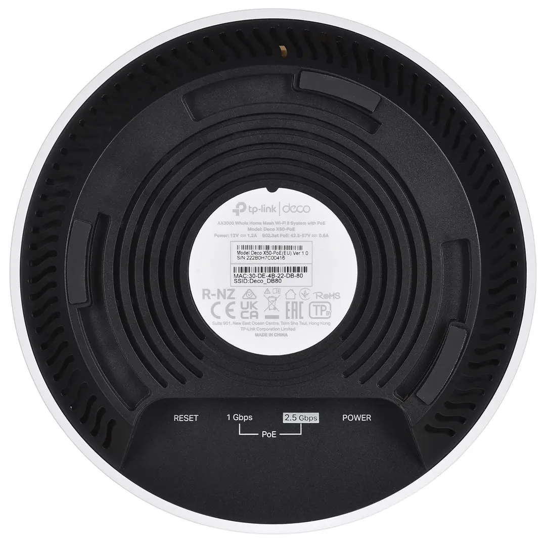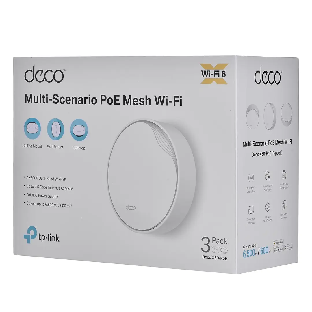 Multi-Scenario Mesh WiFi Meets All Your NeedsAX3000 Whole Home Mesh WiFi 6 System with PoEMultiple Installation Options,Put Your Deco Anywhere You WantDeco X50-PoE has flexible installation to meet various demand scenarios. Place it on a tabletop or install it on a ceiling or wall with our adaptive accessories.Ideal for Non-Stop EntertainmentsArmed with WiFi 6 technology, Deco whole home mesh WiFi is designed to deliver a huge boost in coverage, speed, and total capacity. Get on the latest mesh WiFi to enjoy the future network that loads faster and connects more.Powerful AX3000 Dual-Band WiFi SpeedThe latest 1024-QAM boosts speeds up to 3.0 Gbps — ideal for bandwidth-intensive tasks like cloud gaming and 8K video. Families will enjoy immersive live-streaming with flawless video and clear audio without buffering.Multi-Gig 2.5 Gbps PoE PortArmed with a 2.5 Gigabit Ethernet Port, Deco X50-PoE delivers exceptional multi-gigabit performance to support the insatiable demand for better and faster WiFi. Breakthrough the 1G bottleneck and drive your devices to peak performance. Or using 2.5 GbE port to enjoy blazing-fast wired connections.Power over Ethernet for Simplified Network DeploymentDeco X50-PoE is designed to use a single Ethernet cable for both data and power transmission. It also supports DC (power adapter included) power supply for flexible installations.No FussSimplify the installation and streamline the deployment—no need for electricians.Cost-EfficiencyNo need for additional cables and power adapters—reduce costs on infrastructure.FlexibilityMore placement options allow for deployment in complex environments.Cover Every Corner of Your HomeDeco units work together as a powerful mesh network to boost broader coverage for connections in every corner.Want more coverage? Simply add another Deco. All TP-Link Deco can work together.Engineered for More DevicesDeco products are aimed to dramatically improve capacity and efficiency in traffic-dense environments. No matter how many screens or devices are on at once, everyone is able to enjoy a more efficient network that loads faster without dragging down performance.Intelligent Networking for a Smarter HomeDeco uses its custom algorithms to automate the connections on your network, ensuring the strongest possible signals at all times.Seamless Roaming with One WiFi NameTP-Link Mesh means Deco units work together to form one unified network. Your phone or tablet automatically connects to the fastest Deco as you move through your home, creating a truly seamless WiFi experience.Whole Home CoverageEliminate weak signal areas throughout your houseSmart RoamingUninterrupted streaming when moving between roomsOne WiFi NameNo more switching WiFi network namesUnified ManagementControl your home WiFi by managing the central node via the Deco AppCompact Design, Easy to MountExceptional performance with compact design ensures simple WiFi installation while saving space. The elegant appearance makes Deco X50-PoE with a delicate body case makes it perfect to blend into various home decorations.Simple. Easy. Yet Powerful.Setup and manage your network anytime and anywhere on the user-friendly TP-Link Deco app. In just three easy steps your entire home can be blanketed in strong and reliable WiFi.Easy ManagementManage your WiFi at home or away on the Deco app. See every connected device, prioritize your own, and set up a guest network.Voice ControlUse an Amazon Alexa or Google Assistant-enabled device to control Deco X50-PoE with just your voice.All Decos Work TogetherDeco X50-PoE is compatible with every other Deco model to form a Mesh network. Expand Mesh WiFi coverage anytime by adding more Decos.
